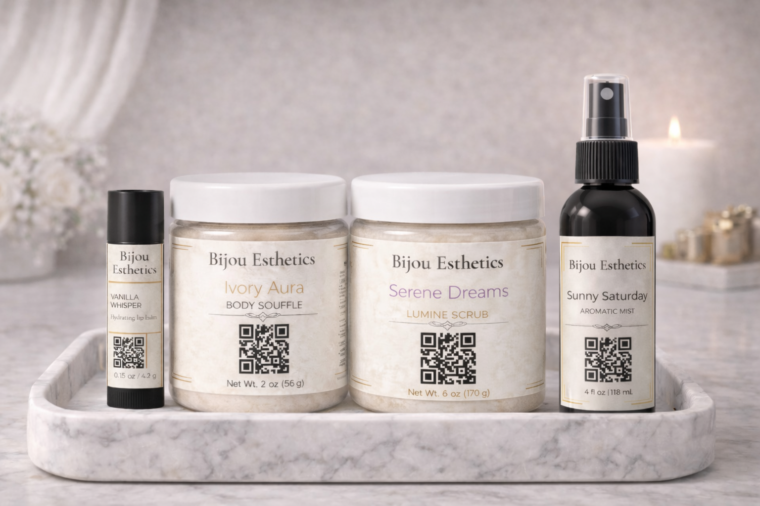 Born from a love of beauty, softness, and sensory experience, Bijou Esthetics was created to remind people that self-care is not a luxury reserved for special occasions—it is a daily routine, an intimate moment of grace. Every formula, scent, and texture is intentionally designed to comfort the skin, soothe the spirit, and transform the ordinary into something indulgent.
